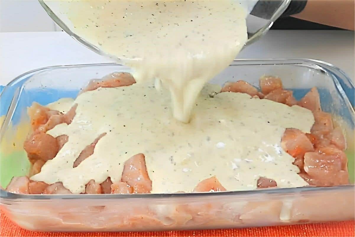 - Mexa tudo para misturar e derrame esse creme no refratário, por cima do frango.