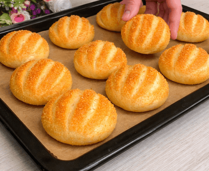 - Após o crescimento, divida a massa em pequenas porções e modele os pãezinhos. Coloque-os em uma assadeira forrada com papel manteiga.