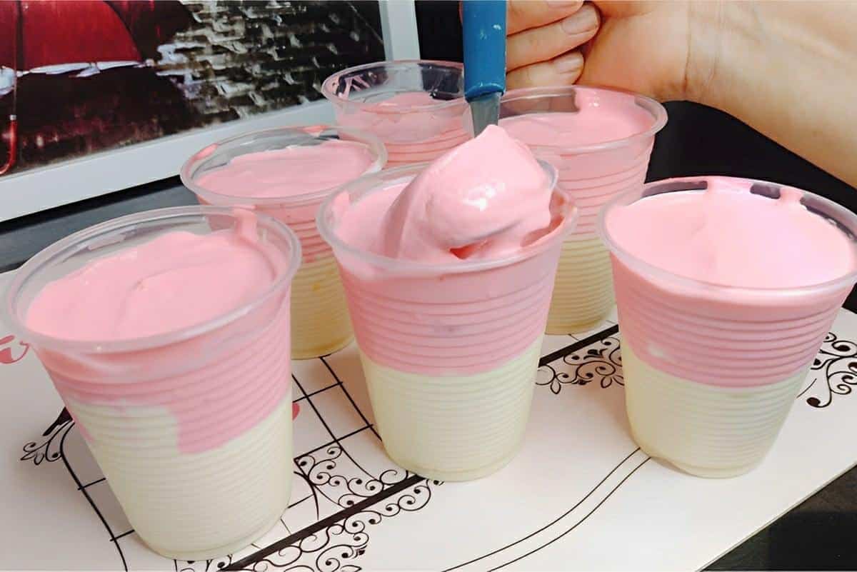 - Despeje essa mistura até metade do copo descartável. Repita o processo com o restante do creme.