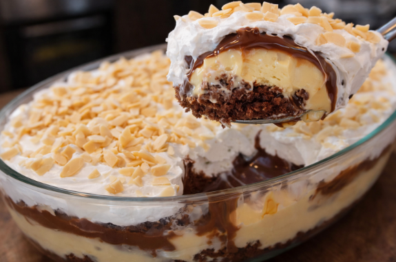 3. Derretemos o chocolate ao leite no micro-ondas e misturamos com o creme de leite, formando uma ganache irresistível. Espalhamos essa deliciosa cobertura sobre a mousse, criando a terceira camada dessa sobremesa dos deuses.